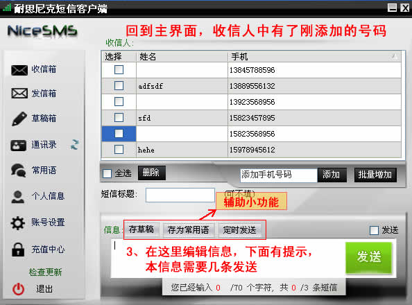 第五步,回到主界面,收信人中有了剛從通訊錄中添加的聯系人,在下面編輯短息,完成后點擊“發送”