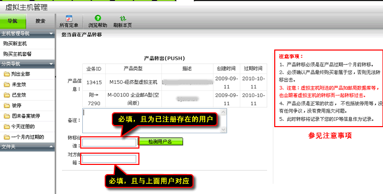 3、注意:虛擬主機附送的產品如郵局數據庫等,也會跟著虛擬主機的轉移而一起轉移過去。
