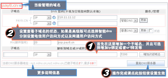 | 以下操作均以pay8.cn做為示例域名,請操作時結合自己的域名 域名申請成功后,默認有www.pay8.cn,pay8.cn兩個域名設置記錄,以及一個泛域名設置記錄。 1、如果要設置pay.cn/www.pay8.cn的解析,請在對應的文本框中輸入解析的ip地址,或者選擇cname以及轉發等分別設置 2、泛域名設置,要設置泛域名解析,請勾選泛域名記錄行后的“開啟”復選框即可設置泛域名功能 3、要設置其它的子域名,請在最下的文本框輸入子域名,并選擇解析或者轉發等,再設置好具體的地址后點“增加子域名”按扭既可增加成功,也可在增加成功后修改解析或者轉發地址。 4、高級版本的DNS管理系統具有智能DNS解析功能,增加子域名后,既可選擇智能DNS功能,此時同一個子域名就有“電信”和“網通”兩個不同的設置選項,您可以有針對的分別設置。 |